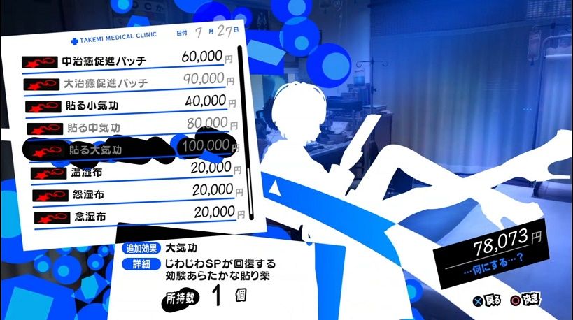 ペルソナ5、アクセサリーの貼る大気功は値段は高いけど絶対に買った方がいい!武見診療所でしか買えないし武見と関係が深くならないと買えないけど貼る大気功さえあれば戦闘中にSPが7も回復するからSPぶそくで困ることがなくなる!#ペルソナ5