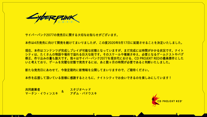 We have important news regarding Cyberpunk 2077’s release date we’d like to share with you today. https://t.co/aWdtR0grYV
