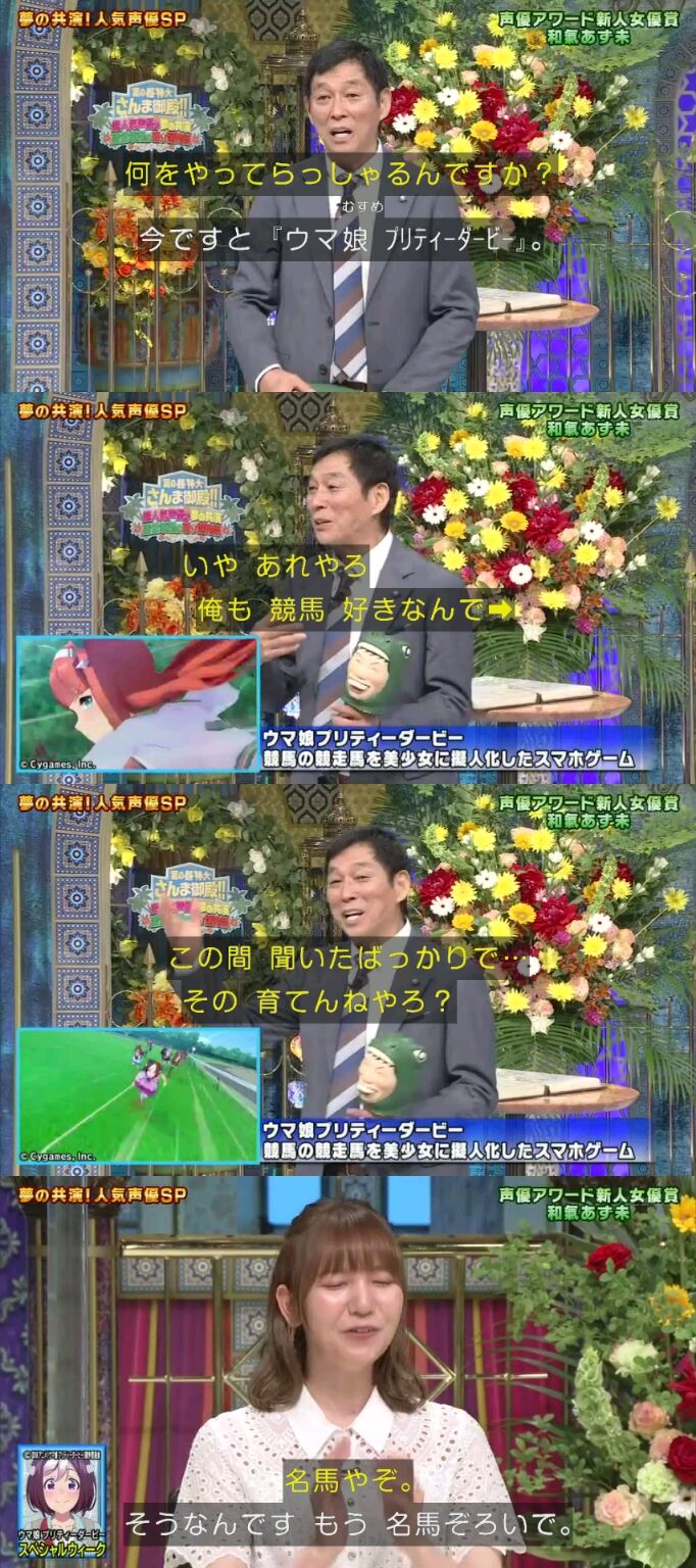 競馬好きの明石家さんまに和氣は「(ウマ娘の)スペシャルウィークというキャラクターをやらせていただいております」と自己紹介すると、